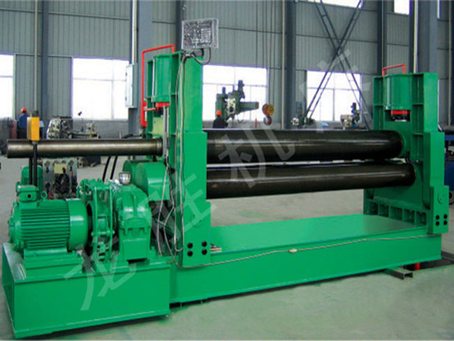 该机结构型式为三辊对称式,上辊在两下辊中央对称位置作垂直升降运动,通过液压缸内的液压油作用于活塞而获得,为液压传动,两下辊作旋转运动,通过减速机的输出齿轮与下辊齿轮啮合,为卷制板材提供扭矩。